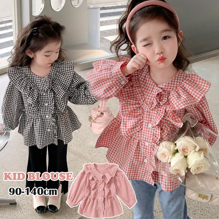 キッズ 女の子 フリル付き シャツ ブラウス 90 100 110 120 130 140 ベビー 赤ちゃん 可愛い 長袖 春 薄手 ジュニア 子供シャツ チェック柄 トップス お出かけ 保育園 通園