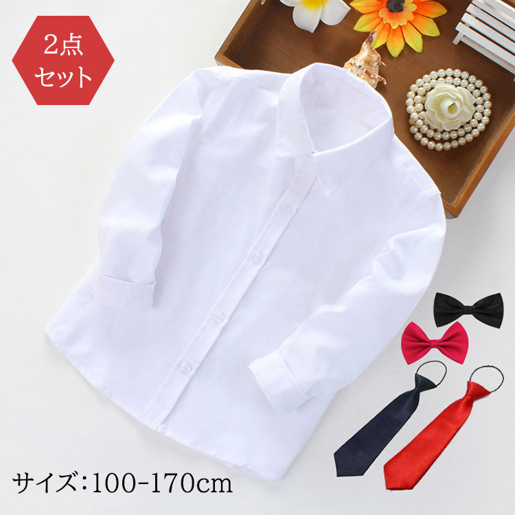 子供シャツ ワイシャツ ホワイト 白 男の子 シャツ 長袖 キッズ ジュニア 学生用 フォーマル シャツ 無地 2点セット シャツ ネクタイ付き コットン 綿 重ね着 大きいサイズ 小学生 中学生 高