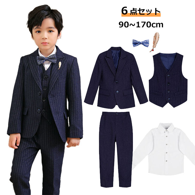 男の子 子供 フォーマルスーツ キッズ スーツ フォーマル ジュニア 結婚式 入学式 入園式 上下6点セット ストライプ 紺 ジャケット シャツ ベスト パンツ ズボン 蝶ネクタイ ブローチ 発表会