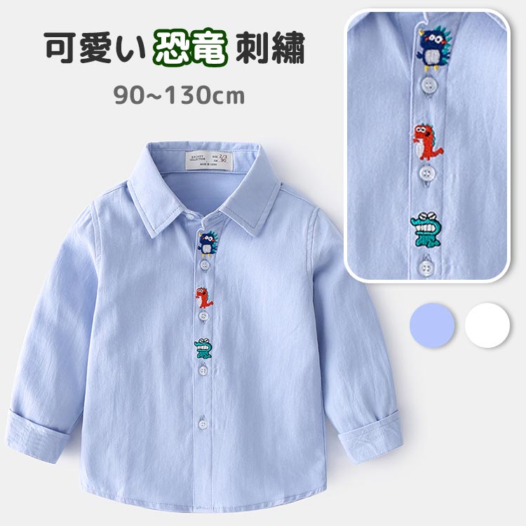 シャツ 恐竜 キッズ ベビー 男の子 子供 ダイナソー 綿 コットン 小学生 幼稚園 可愛い おしゃれ 格好いい 重ね着 長袖 春 秋 カジュアル ジュニア 通園 通学 コーデ 恐竜 ブルー ホワイト