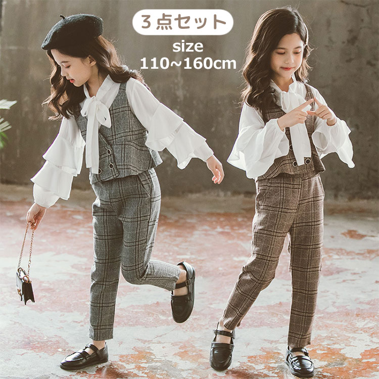 女の子 ブラウス パンツ ベスト 3点セット カジュアル セットアップ 子供 子ども キッズ チェック柄 リボン お洒落 おしゃれ かわいい 格好いい 可愛い お出かけ ファッション 110 120