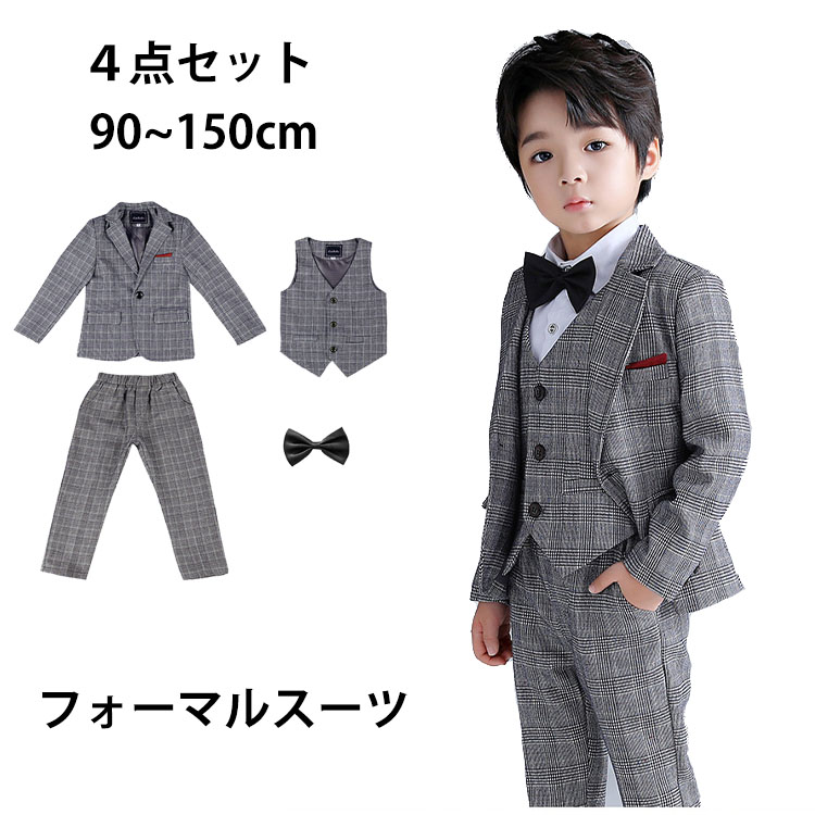 フォーマルスーツ 男の子 キッズ セレモニー チェック 小学生 入学式 子供服 卒園式 卒業式 発表会 結婚式 おしゃれ タキシード 4点セット フォーマル 長袖 ジャケット 蝶ネクタイ パンツ ズボ