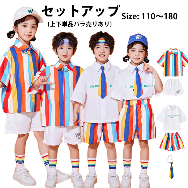 キッズダンス衣装 セットアップ レインボー ストライプ 柄 ネクタイ キッズ ダンス 衣装 ガールズ ボーイズ バラ売り 単品販売 セットアップ トップス ハーフパンツ カラフル ストライプ