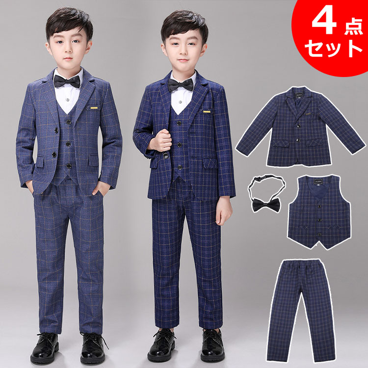 キッズ フォーマルスーツ 男の子 子供 子ども スーツ フォーマル ジュニア 卒業式 結婚式 入学式 入園式 上下4点セット チェック柄 紺 ジャケット ベスト パンツ ズボン 蝶ネクタイ 発表会 卒
