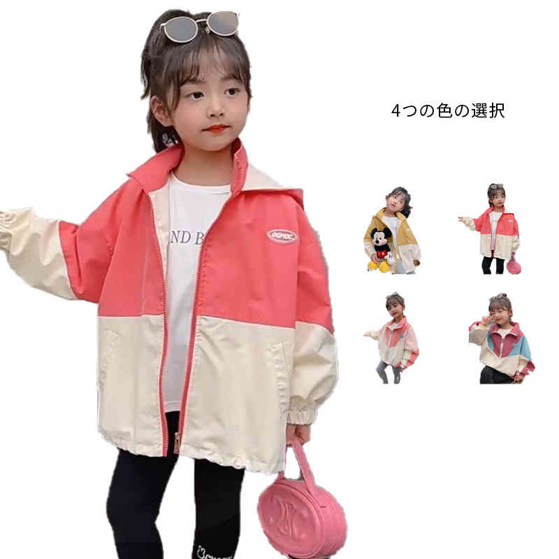 キッズ ウィンドブレーカー 子供服 女の子 アウター フード付きジャケット トップス 春物 防風 春コート 配色 切り替え お洒落