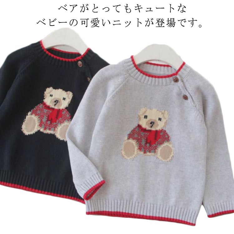 ボタン開閉 長袖 クルーネック 子供服 丸首 幼稚園 トップス 秋 ニット くま 着替えやすい キッズ くまセーター 暖かい 学校 保育園 お出かけ セーター カジュアル 春 男の子