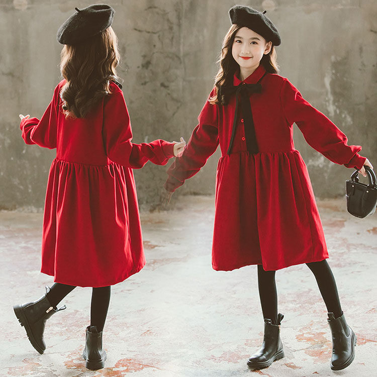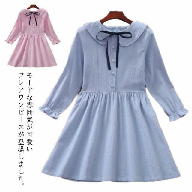 女の子 女児 ドレス キッズ ガールズ 子供服 コットン 薄手 カジュアル 可愛い ゆったり おしゃれ 通園 通学 長袖 襟付き 春秋物 ジュニア