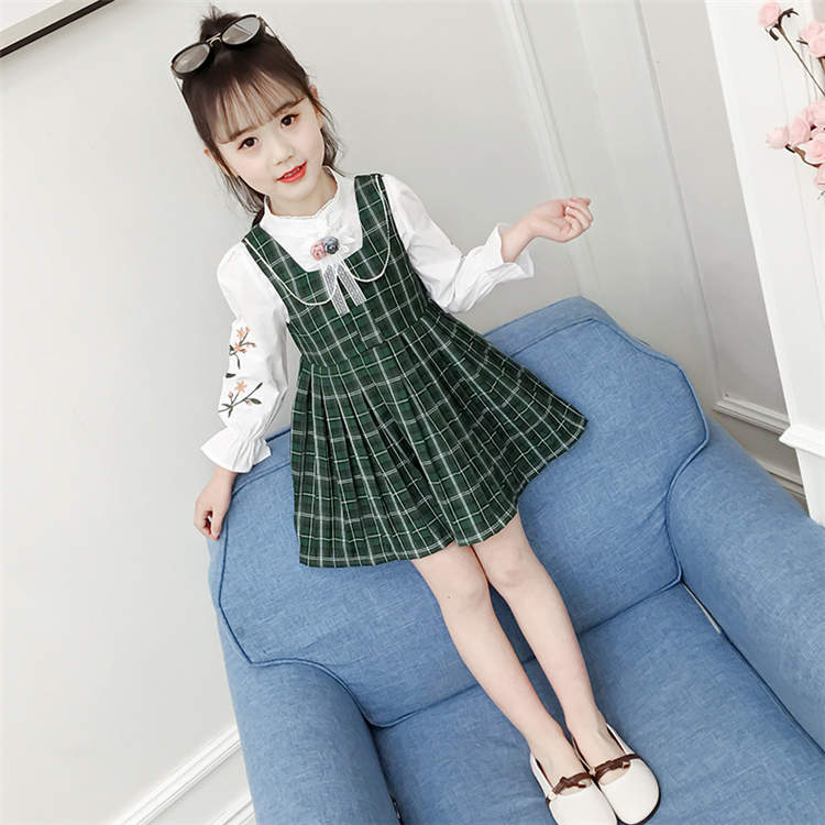 サスペンダー ワンピース 子供服 シャツ キッズ ドレス チェック グリーン ピンク Aライン 膝丈 ミディアム 刺繍 パフスリーブ
