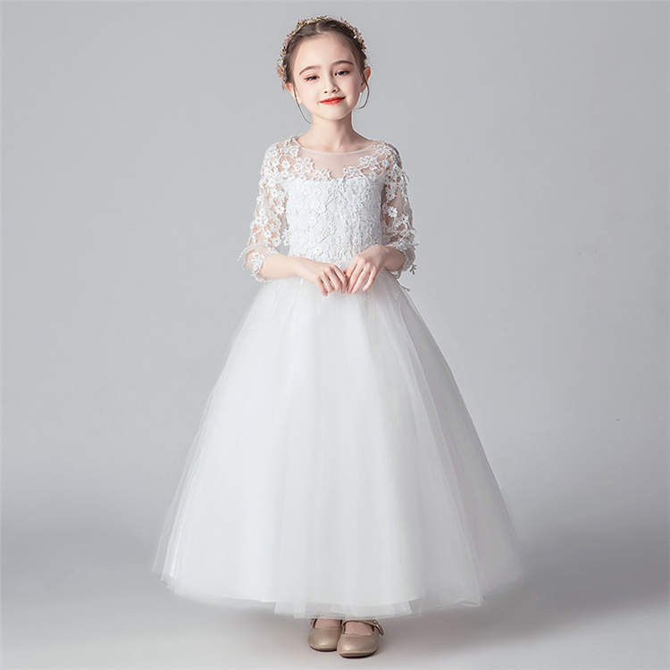 結婚式 子供ドレス キッズ チュール マキシ丈 長袖 子供 ワンピース 優雅 エレガント レース ジュニア ガールズ シースルー