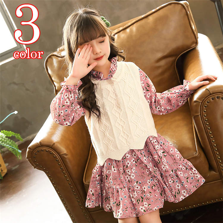 二点セット ワンピース キッズ 子供服 ベスト ニット セーター 花柄 長袖 セットアップ ドレス 秋 春 ミディアム丈 エレガント