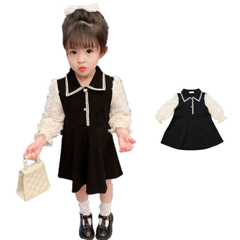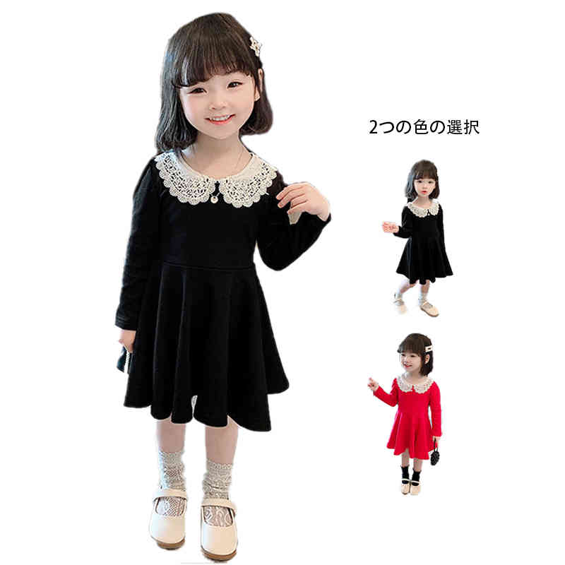 フレアワンピース お嬢様ワンピース 長袖 ロングワンピース レース付き 折襟 レースワンピースキッズ ベビー マタニティ キッズファッション ワンピース