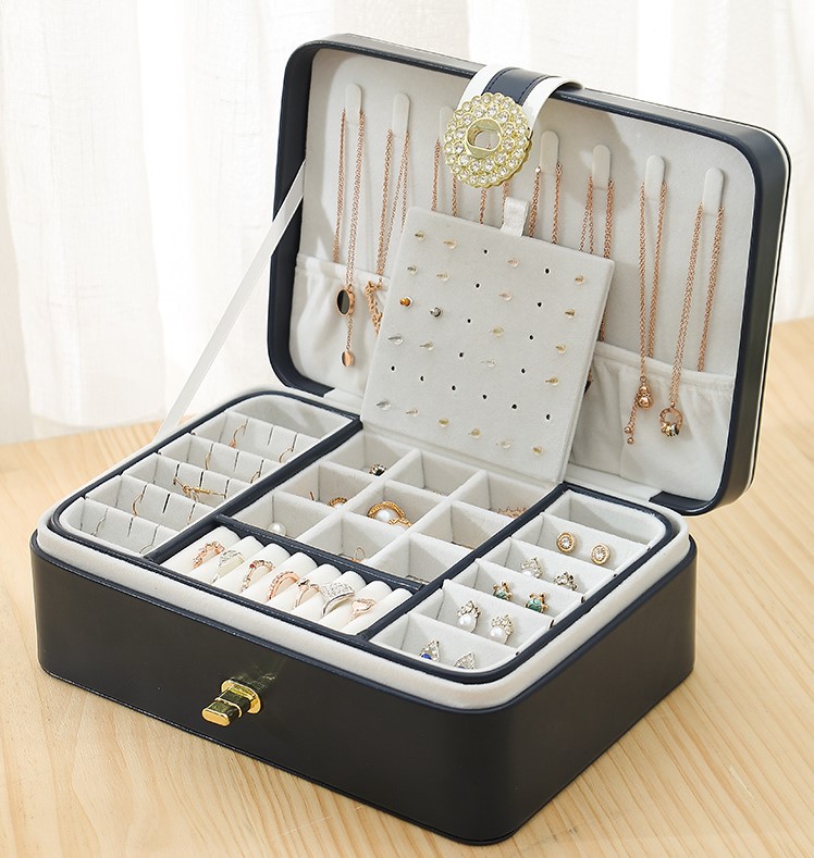 ジュエリー2段ボックス3色収納ピアス指輪ネックレスアクセサリーリング時計白ホワイトピンクネイビー紺かわいいおしゃれ韓国大容量ケースコンパクト小物入れ仕分け卓上机上高見えキラキラ高級ポーチレザー革
