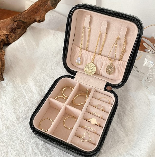 ジュエリーボックスピアス指輪ネックレスアクセサリーリング持ち運び黒ブラック白ホワイトピンクかわいいおしゃれ韓国大容量ケースコンパクト小物入れ携帯旅行スタンドレザー革チャック仕分け卓上机上高見え