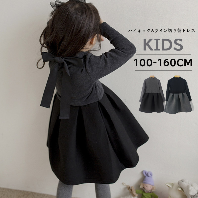 ハイネックAライン切り替えワンピース ブラック グレー ドレス ピアノ 発表会 七五三 大人気 お姫様ドレス 冠婚葬祭 長袖 パーティー 結婚式 二次会
