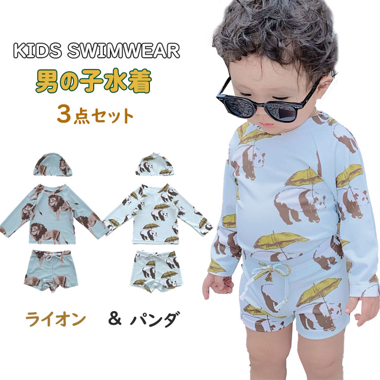 キッズ 水着 男の子 長袖 かわいい パンダ ライオン キャップ付き セパレート 3点セット ベビー水着 ジュニア ラッシュガード スイムウェア 子ども 子供 小学生 ウエスト紐 調節可 紫外線対策