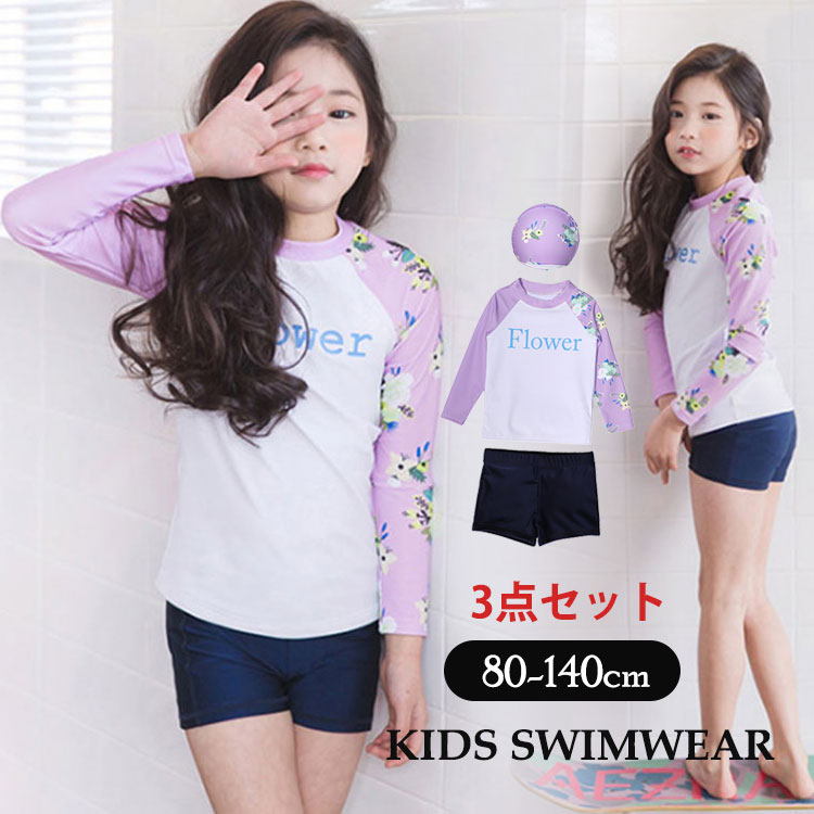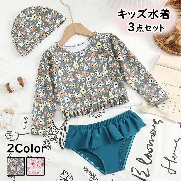 ベビー水着 キッズ セパレート 水着 女の子 長袖 3点セット キャップ付き 紫外線対策 日焼け防止 かわいい お花柄 2色 キッズ スイムウエア スイムスーツ 赤ちゃん 保育園 幼稚園小学生 オシャ