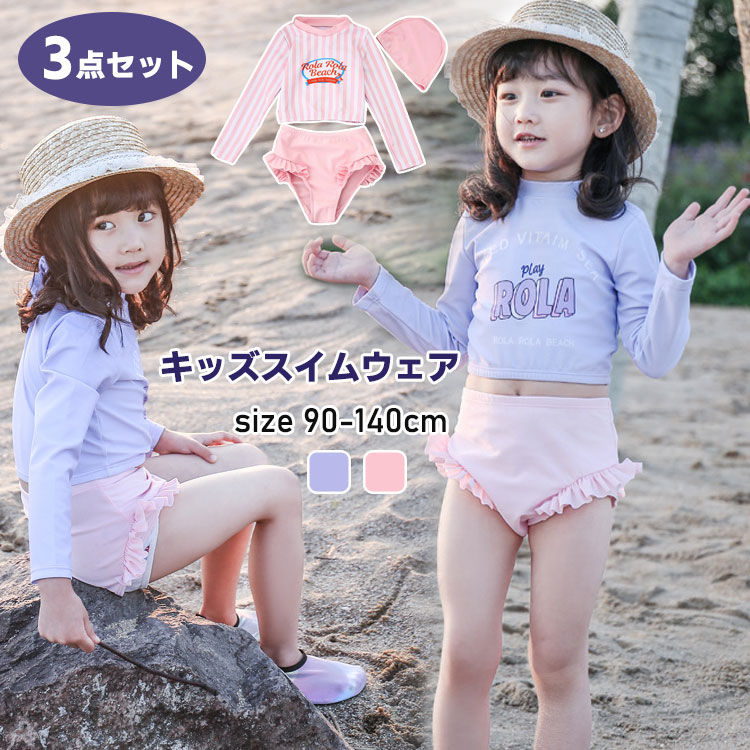 水着 女の子 ベビー キッズ スイムウェア ラッシュガード 長袖 かわいい セパレート 3点セット トップス ショートパンツ キャップ付き 紫外線対策 日焼け防止 ジュニア 子ども 幼稚園 小学生 オ