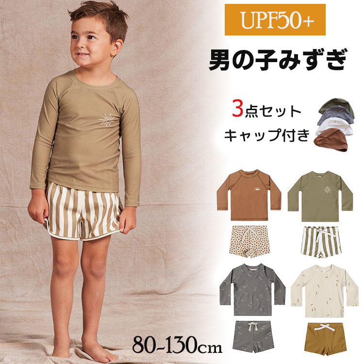 水着 男の子 長袖 キャップ付き 上下3点セット 50+ カット キッズ ベビー水着 ジュニア ラッシュガード スイムスーツ スイムウェア セパレート 子ども 子供 小学生 ウエスト紐 調節