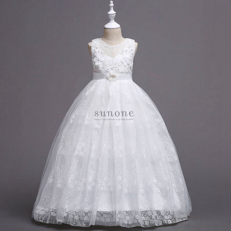 女の子 フォーマル ロング ドレス ノースリーブ リボン シンプル ホワイト発表会 パーティードレス 結婚式 120 130 140 150 160 170cm