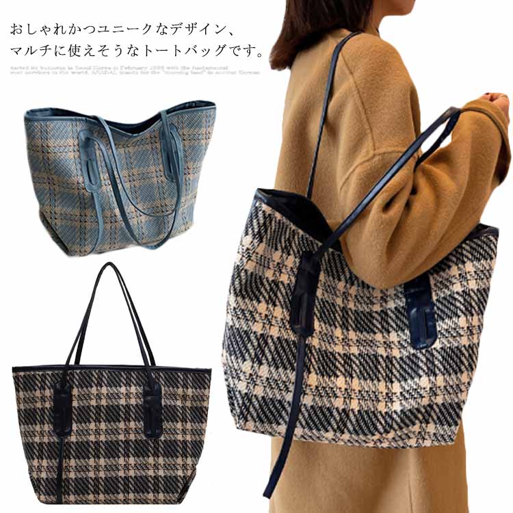 チェック柄 トートバッグ 全2色 かばん 肩掛け バッグ レディース シンプル ファスナー 収納 デイリー カジュアル 秋 大容量
