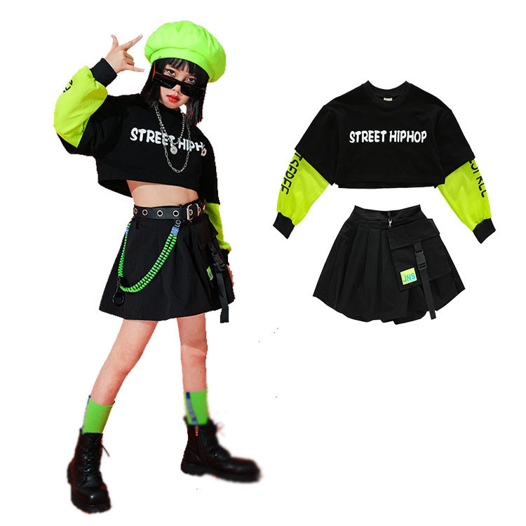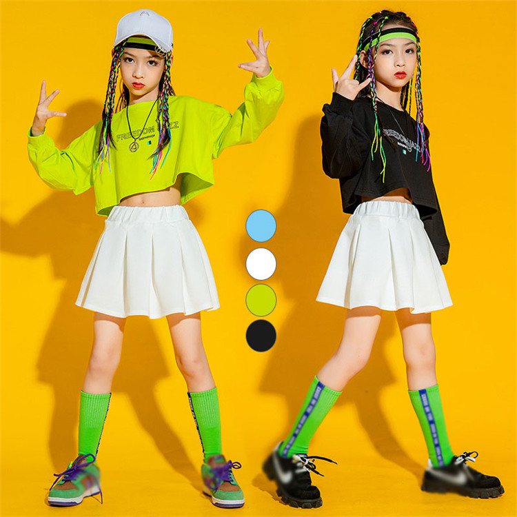 二点セット スカートセット ヒップポップ 長袖 シャツ 白 スカート 子供 女の子 へそ出し ダンスウェア ジュニア スポーツ ジャズ カジュアル シンプル 普段着 応援団 ブラック グリーン ブル