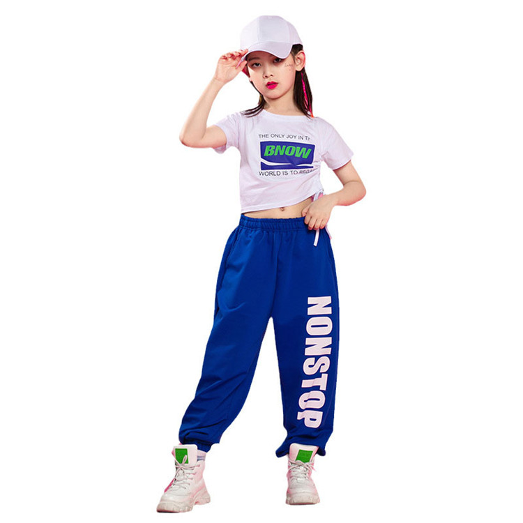 二点セット Tシャツ 長ズボン ヒップポップ へそ出し 子供 女の子 ダンスウェア ジュニア スポーツ ジャズ カジュアル シンプル ホワイト ブルー 普段着 応援団 運動会 110~180CM WU
