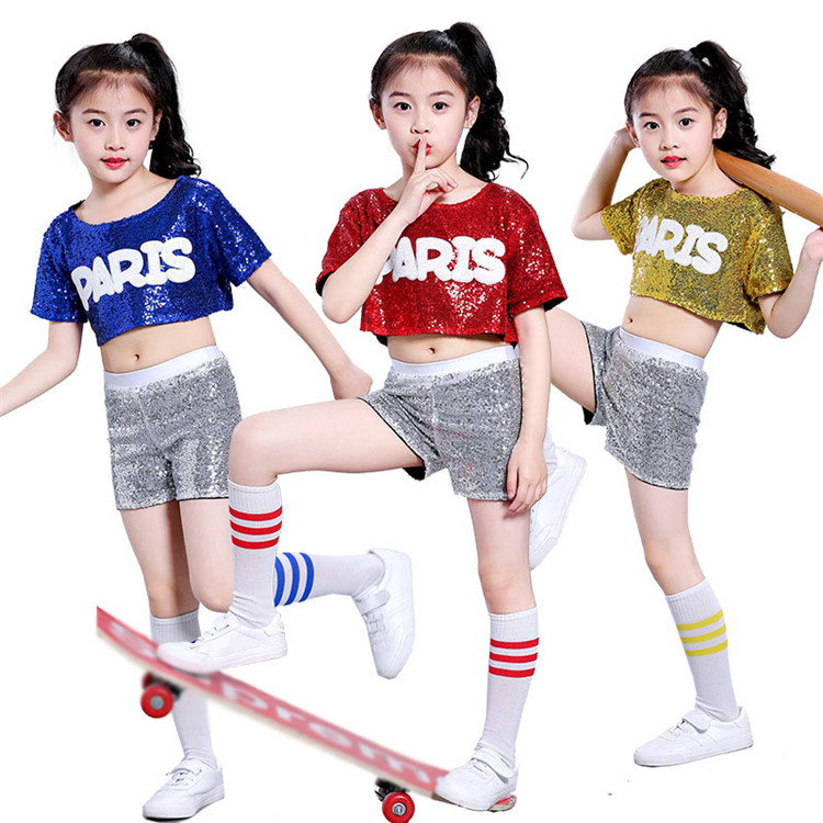 二点セット スパンコール ダンス衣装 ヒップホップ キッズ ダンス 衣装 短パンツ ジャズ 男の子女の子 パンツセット ステージ衣装 キラキラ 運動会 応援団 チアガール 100~160CM WUDA
