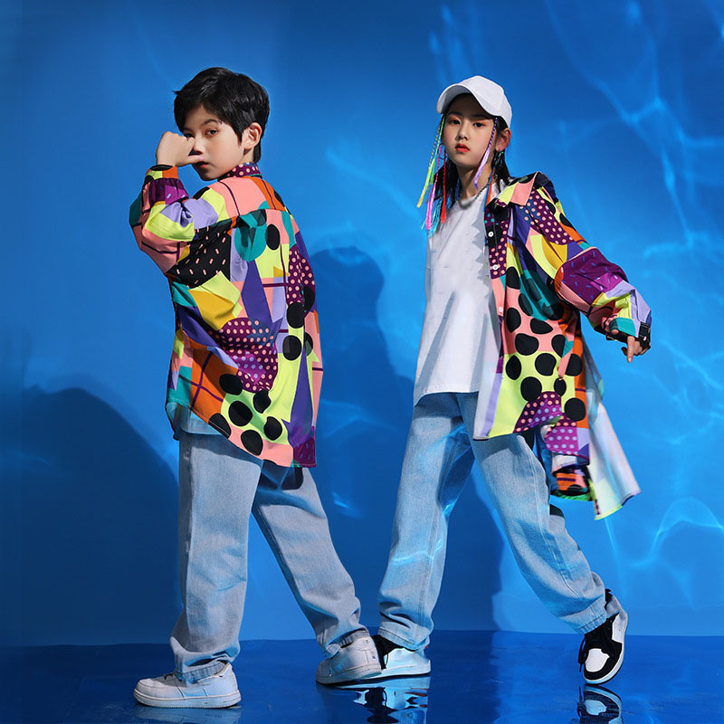 キッズ ダンス衣装 シャツ ヒップホップ ダンス衣装 花柄 幾何柄シャツ ゆったり 女の子 男の子 長袖 子供 団体服 応援団 ステージ衣装ストリート系 演出服 練習着 WUDAO-134