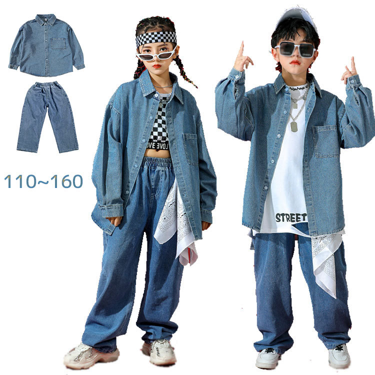 二点セット デニム シャツ 長パンツ 男の子 女の子 キッズダンス衣装 ヒップホップ ダンス 韓国風 普段着 ダンスウェア ジュニア 応援団 ジャズ かっこいい ゆったり ジーパン 日常用 110~1