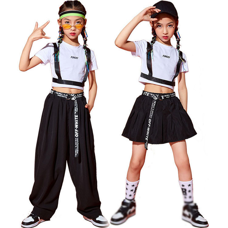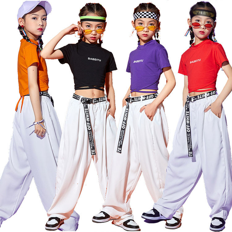 二点セット Tシャツ ワイドパンツ 白 長袖 ヒップポップ へそ出し 子供 女の子 ダンスウェア ジュニア スポーツ ジャズ カジュアル シンプル 普段着 応援団 運動会 110~170CM WUDA