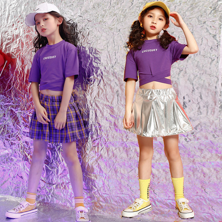 シャツ スカート ヒップポップ Tシャツ チェック柄 子供 女の子 へそ出し ダンスウェア ジュニア スポーツ ジャズ チームお揃い 普段着 応援団 運動会 チアガール カジュアル シンプル パープル