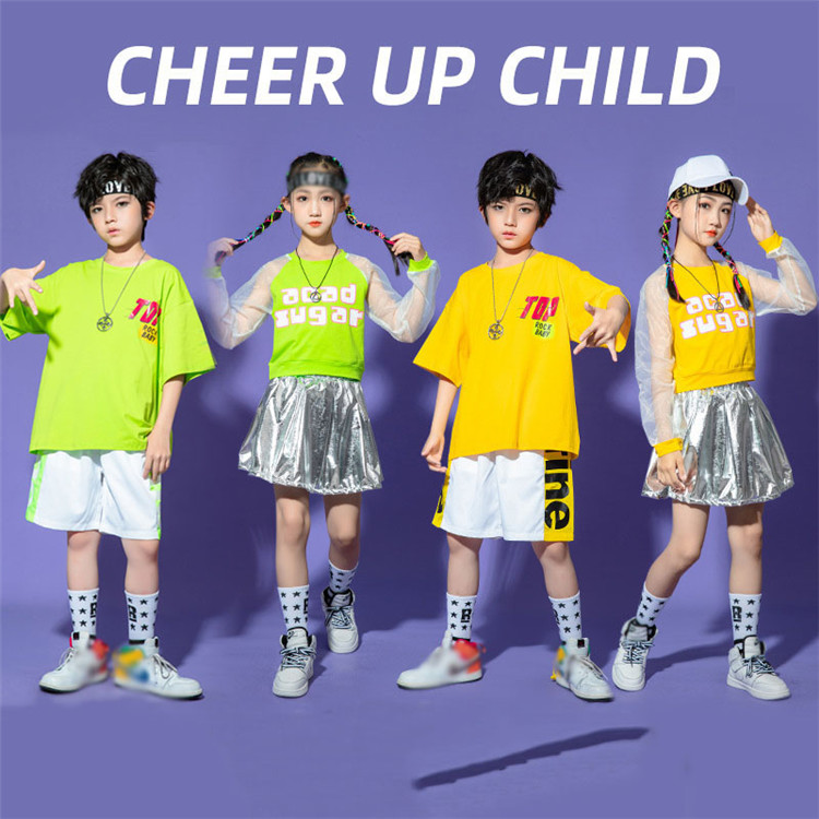 二点セット チア ダンス衣装 ヒップホップ キッズ ダンス 衣装 パンツ スカート ジャズ 男の子 女の子 シルバー グリーン イエロー 応援団 カジュアル チームお揃い チアガール 110~170C