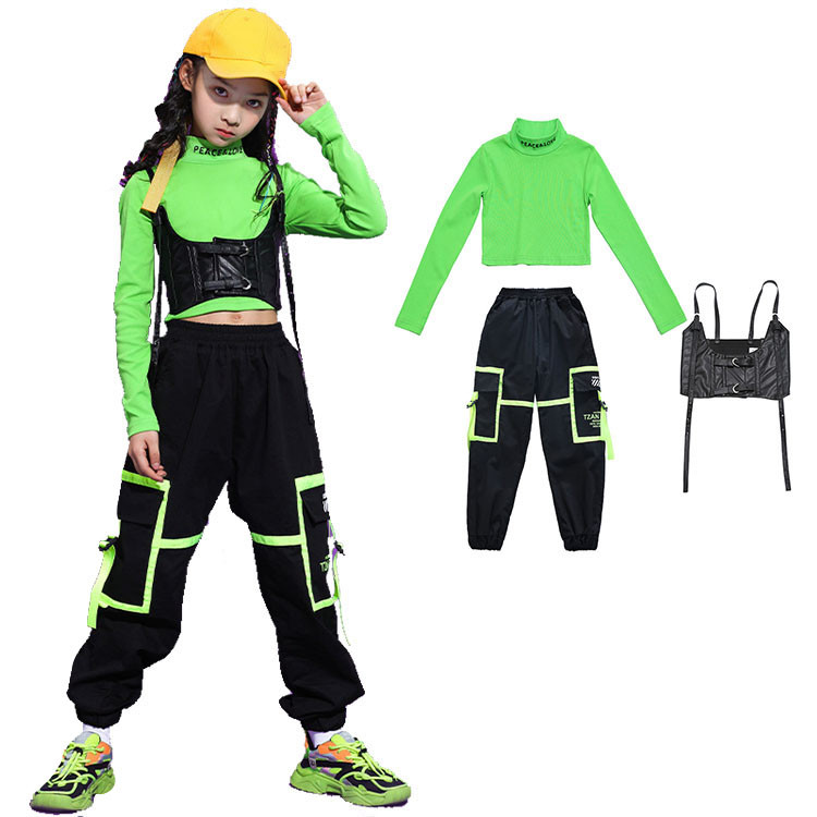 Tシャツ グリーン 長ズボン ブラックベスト 長袖 春秋 ヒップポップ かっこいい 子供 女の子 ダンスウェア ジュニア スポーツ ジャズ カジュアル シンプル 普段着 応援団 運動会 ステージ衣装