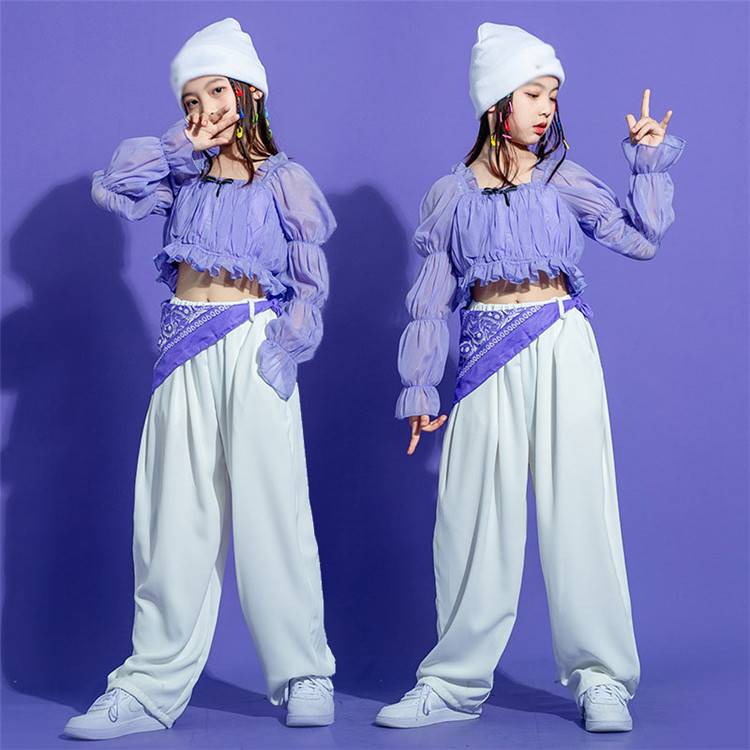 二点セット シャツ +白ワイドパンツ パープル 長袖 ヒップポップ へそ出し 子供 女の子 ダンスウェア ジュニア カジュアル シンプル 可愛い 普段着 応援団 運動会 110~180CM WUDAO