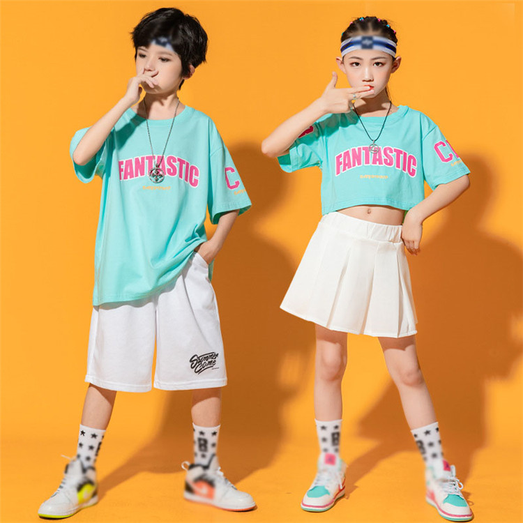 二点セット スカート パンツ ヒップポップ シャツ スカイブルー 子供 女の子 男の子 ダンスウェア ジュニア スポーツ ジャズ カジュアル シンプル 普段着 応援団 チアガール 運動会 チームお揃