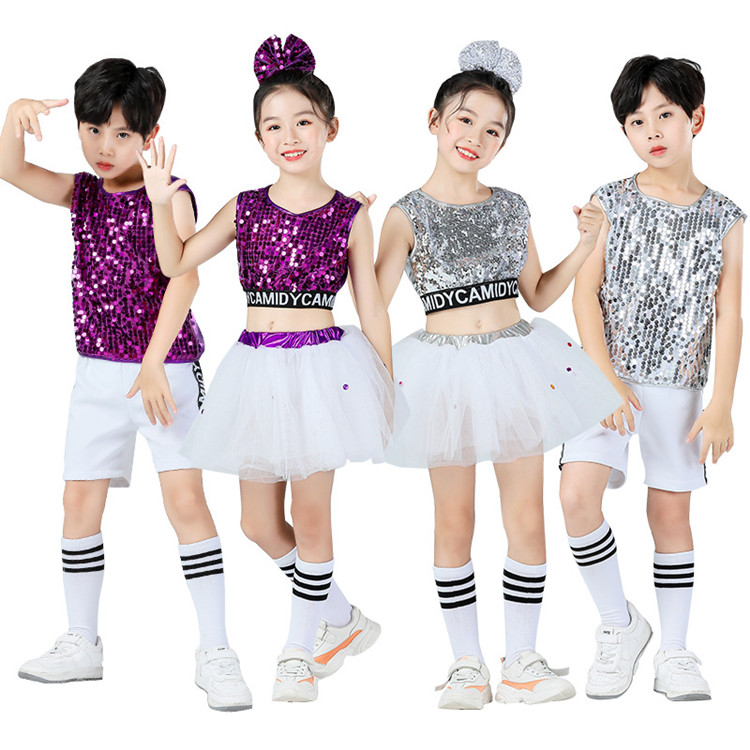 二点セット スパンコール ダンス衣装 ヒップホップ キッズ ダンス 衣装 パンツ スカート ジャズ 男の子 女の子 ステージ衣装 キラキラ パープル シルバー 応援団 チアガール 110~170CM