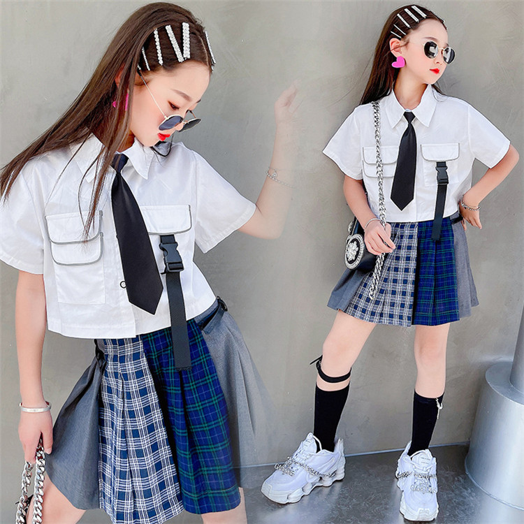 二点セット ダンス 衣装 スカートセット キッズ ガールズ 夏 ヒップホップ ジャズダンス へそ出し プリーツスカート 応援団 練習着 原宿系 可愛い 120~170 -0
