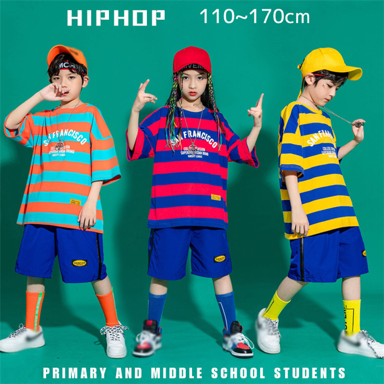 二点セット ボーダー柄 キッズダンス衣装 ヒップポップ Tシャツ ハーフパンツ 五分袖 短パン 子供 女の子 男の子 ガールズ 男女兼用 ダンスウェア ジュニア スポーツ ジャズ カジュアル シンプル