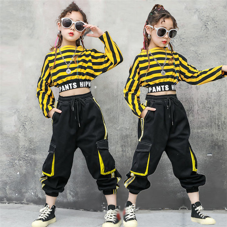 二点セット ボーダー柄 シャツ 長ズボン キッズ ヒップホップ ダンス衣装 ガールズ へそ出し ファッション ダンストップス ジュニア 演出服 普段着 韓国風 110~160CM WUDAO-082
