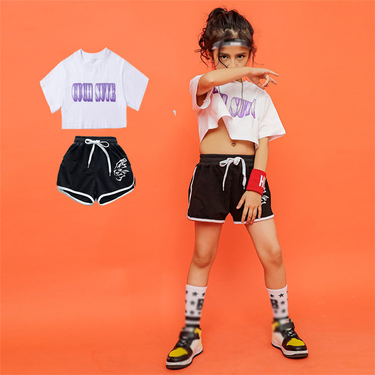 セットアップ キッズ ヒップホップ ダンス衣装 ガールズ へそ出し ファッション ダンストップス 半袖 ショーパン ジュニア 演出服 女の子 普段着 シンプル 110~170CM WUDAO-079
