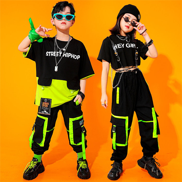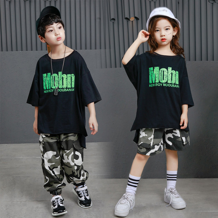 二点セット 子供 ダンス 衣装 ヒップホップ シャツ 半袖 長ズボン 迷彩 ショーパン ブラック 女の子 男の子 キッズ シンプル ステージ衣装 カジュアル 普段着 ジャズ ファション 男女兼用 ゆっ