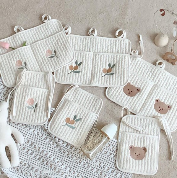 コットン刺繍ポケット3デザインポーチ小物入れくまベアチューリップオリーブ綿壁掛けベビーカーベビーベッドおしゃれシンプル北欧韓国インテリアフックベビーカーバッグ吊り袋ラック収納おむつ哺乳瓶