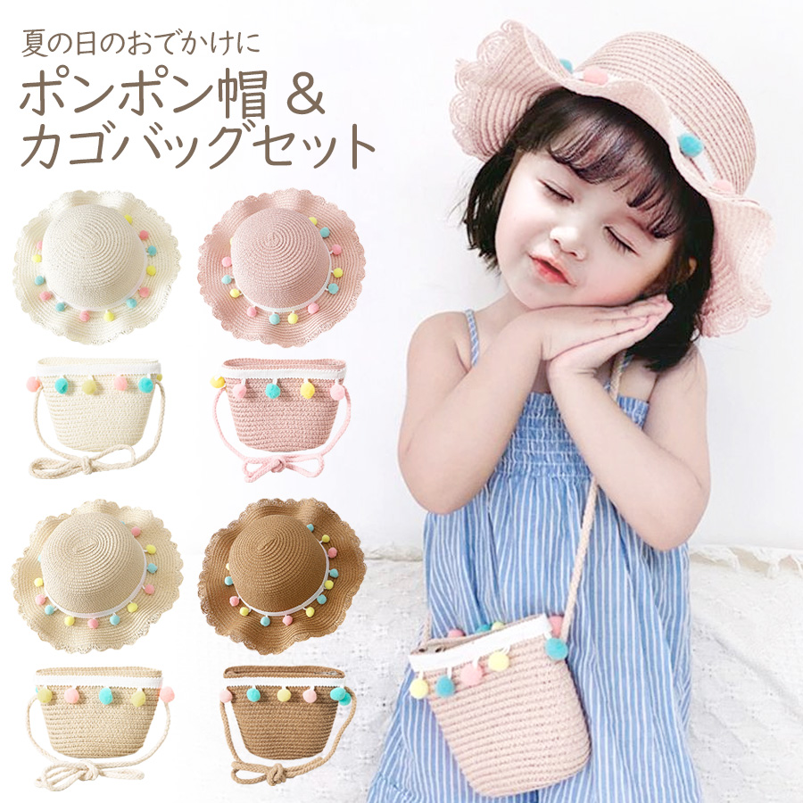 カラフルなポンポンが可愛らしい、ベビー用麦わら帽子とカバンのセット♪ ベビー用 帽子 ベビー帽子 ベビーぼうし ベビーバッグ セット お揃い 2点