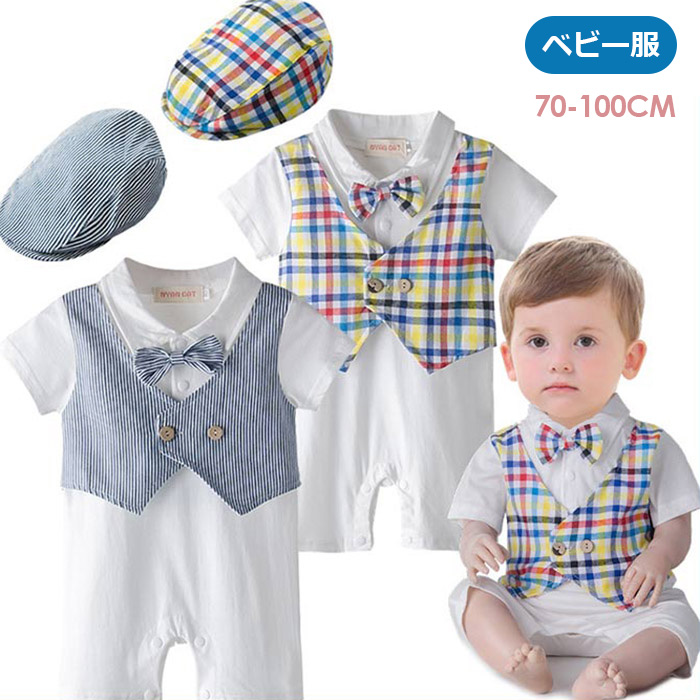 ベビー服チェック柄 ストライプ柄 ロンパース 帽子 2点セット 蝶ネクタイ 半袖 フォーマル 男の子 新生児 幼児 結婚式 カバーオール 出産祝い