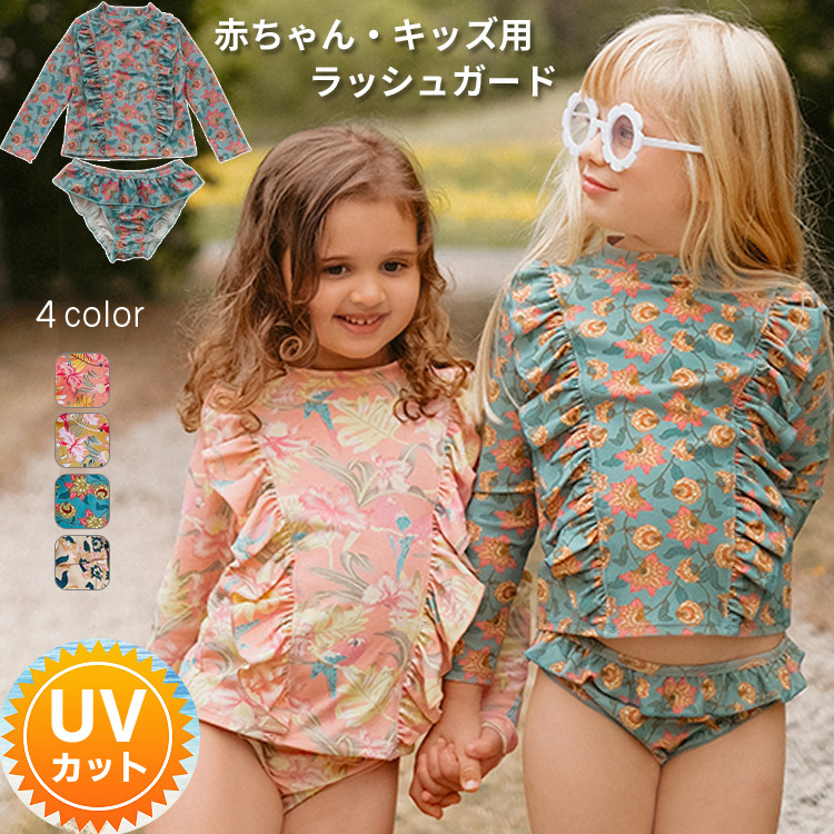 ベビー水着 長袖 お揃い 女の子 男の子 スイムウェア 帽子付き 2点セット かわいい キッズ水着 夏 UVガード 幼稚園 保育園 ラッシュガード 海水浴 海 プール 水遊び 学校用水着 子供用 スク