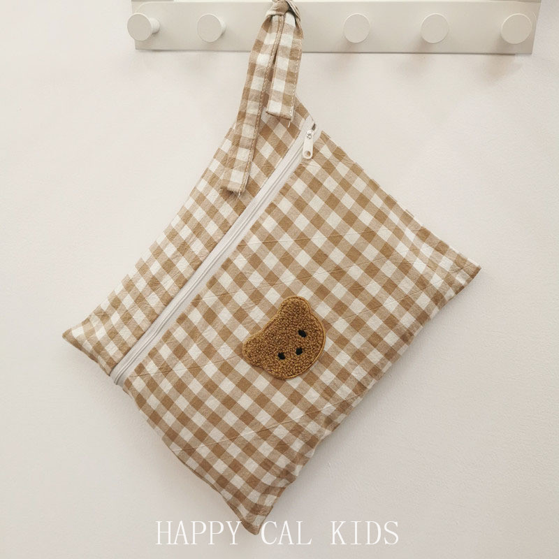 くまチェックポーチ韓国雑貨北欧赤ちゃんおむつポーチ刺繍ミルク化粧おしゃれかわいいトラベルポーチママ大容量 綿マザーズバッグメイク旅行化粧ポーチミニブラウンベージュベアコットン綿リボンチャック