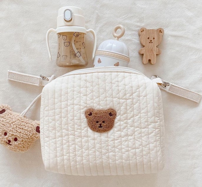 7点セットマルチポーチ赤ちゃんベビーくまベアフックおむつポーチミルクトラベルポーチマザーズバッグ薬服歯磨き食事エプロンカトラリー着替え韓国北欧ナチュラルおしゃれ可愛い小さい大きいコットン綿防水多様