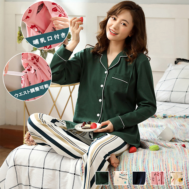 マタニティパジャマ ルームウェア 2点セット マタニティ ママ レディース 授乳口付 長袖 産後 ウェスト調整ゴム付 授乳