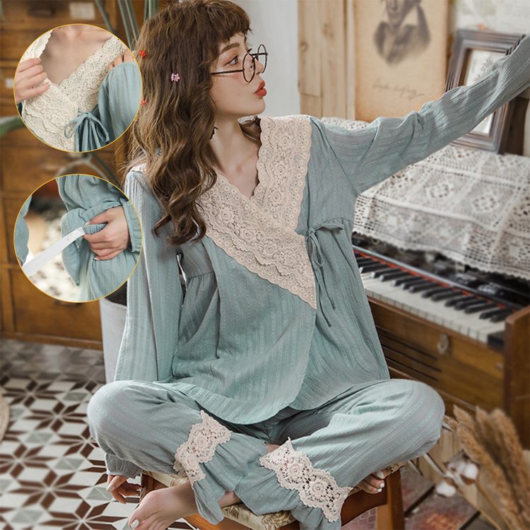 マタニティパジャマ ルームウェア ガーゼ 2点セット マタニティ ママ レディース 綿100% 授乳口付 長袖 産後 ウェスト調整ゴム付 授乳