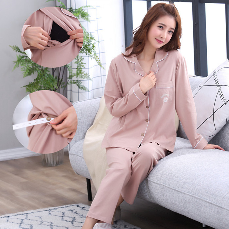 マタニティ パジャマ 授乳口付き 長袖 前開き ロング丈 ウエスト調整機能付き パンツ 春向き 秋向き 産前 産後 入院用 レディース マタニティウェア 無地 かわいい